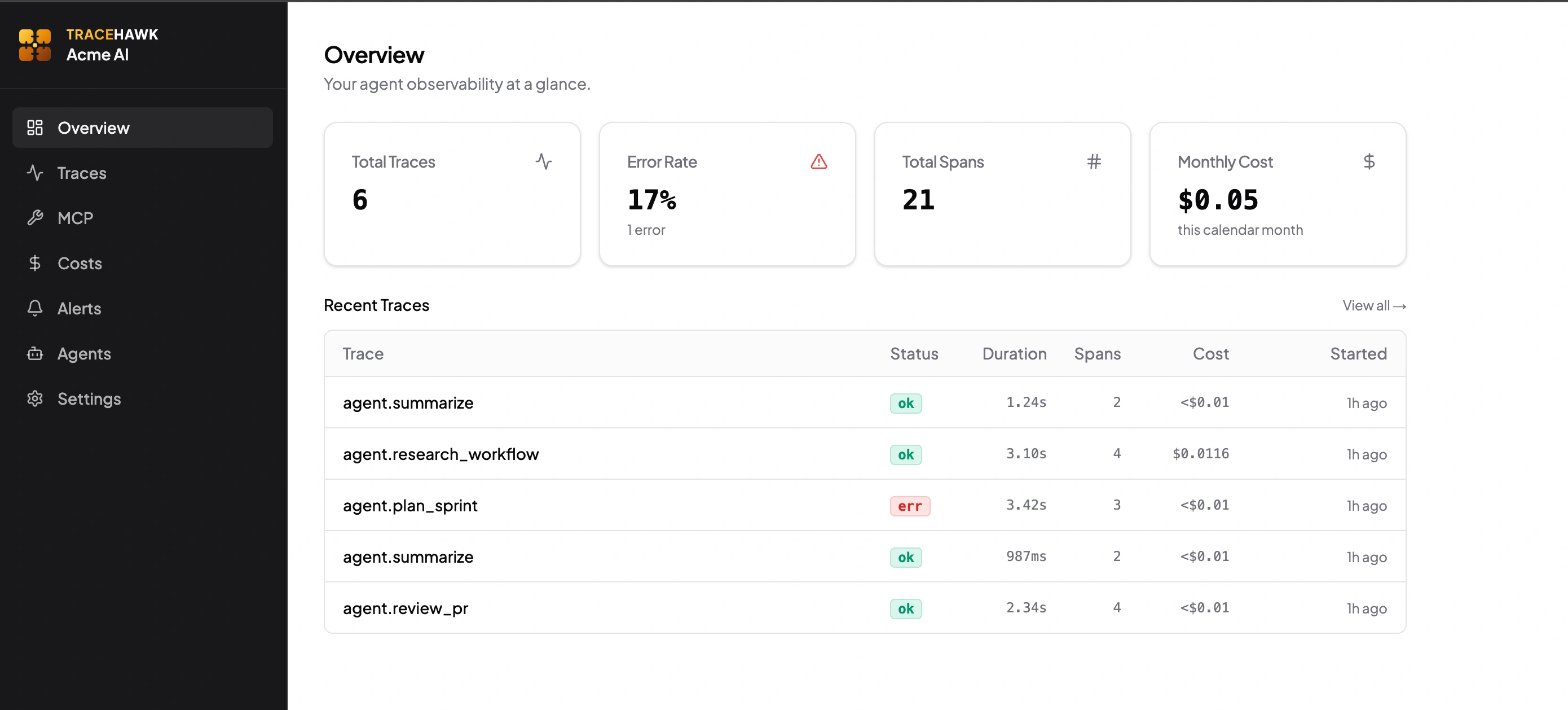TraceHawk gives you full-stack observability for AI agents — span waterfall, decision trees, cost attribution, and real-time alerts. In 3 lines of code.